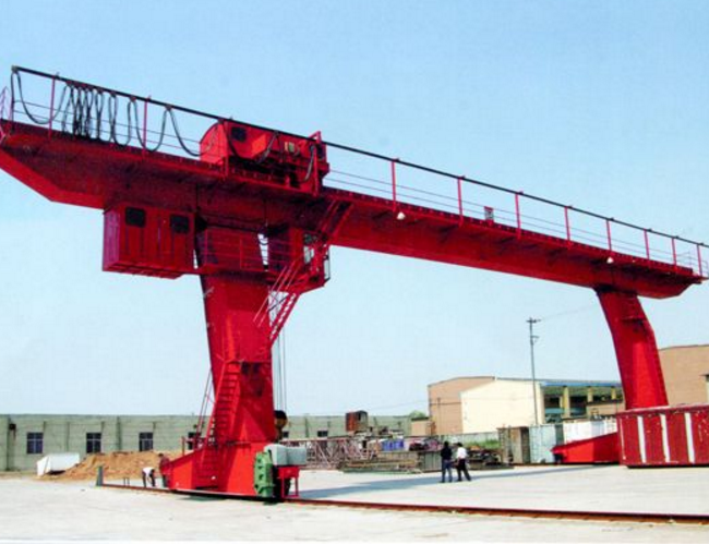单主梁门式起重机结构简单,制造安装方便,自身质量小,主梁多为偏轨箱形架结构。与双主梁门式起重机相比,整体刚度要弱一些。因此,当起重量Q≤50t、跨度S≤35m时,可采用这种形式。单主梁门式起重机门腿有L型和C型两种形式。L型的制造安装方便,受力情况好,自身质量较小,但是,吊运货物通过支腿处的空间相对小一些。C型的支脚做成倾斜或弯曲形,目的在于有较大的横向空间,以使货物顺利通过支脚。